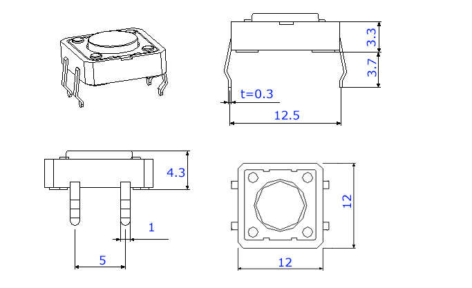 |  | | 型號規(guī)格:TS1243系列 | 中文命名:12*12*4.3插腳型輕觸 |